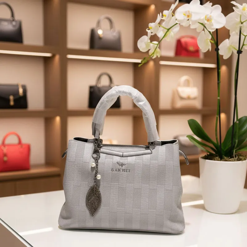This light grey leather handbag is manufactured by the Ban Mei brand. Its textured checked pattern with leaf chain is enhancing its classical beauty. It is a soft PU leather tote handbag. Ban Mei has used synthetic materials to create this premium leather handbag. It is a large-sized handbag with cross-body straps.